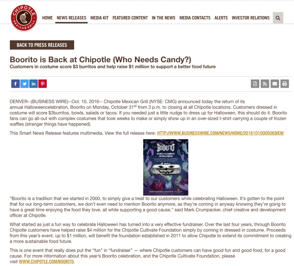 This was one of my favorite assignments, since I am such a huge foodie. I was given the chance to work on plenty of Chipotle’s flagship events (such as Boorito, BOGO for Active Military and Chiptopia Chipotle Rewards), launch their style guide and Real Ingredients interactive ingredient glossary and manage ShopHouse and Pizzeria Locale.